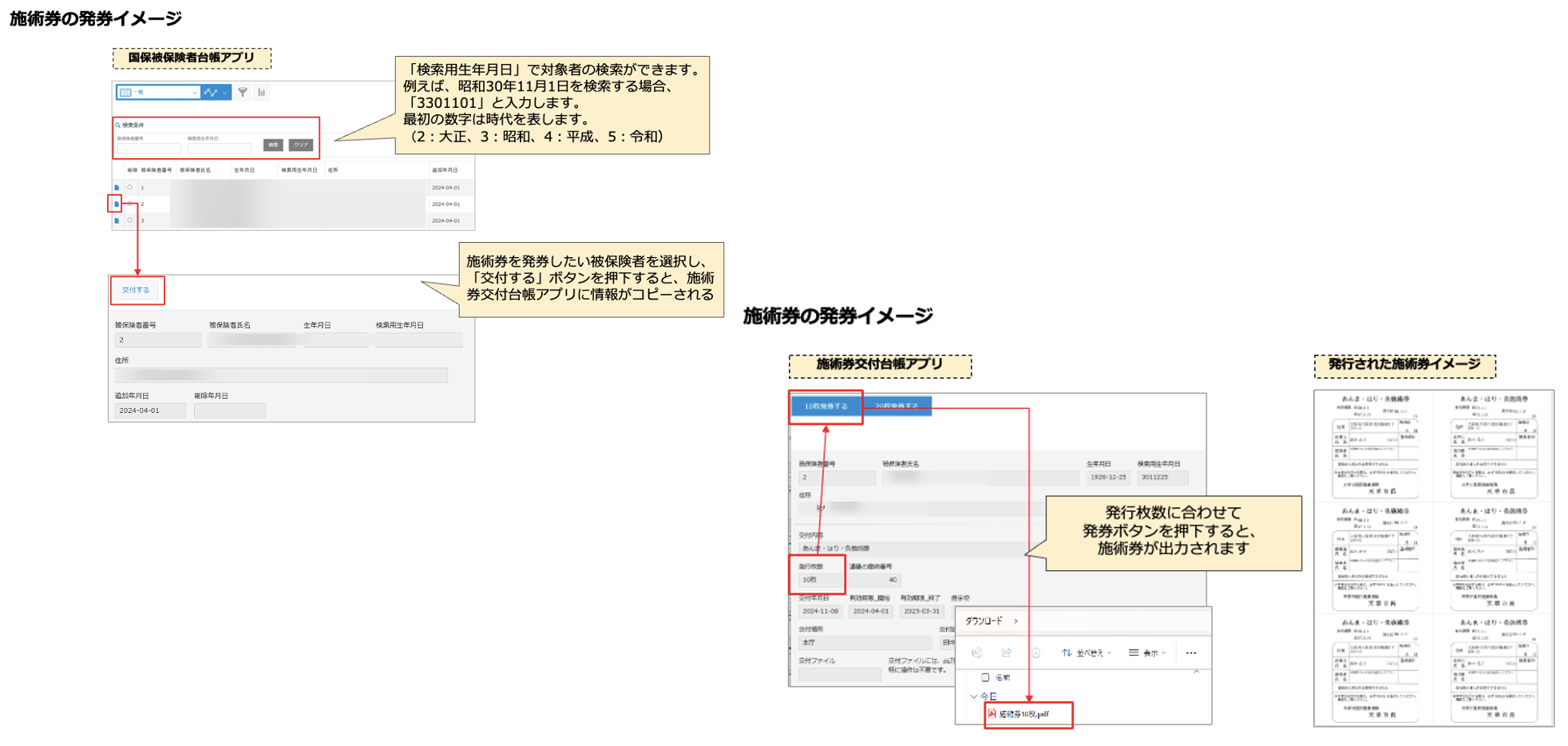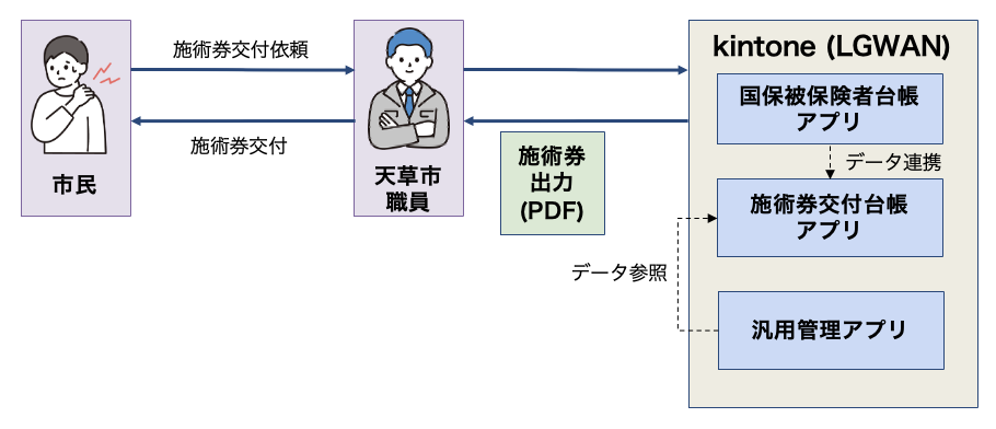 被保険者台帳に登録されている対象者に対して「あん摩・はり・きゅう施術券」を発行し、その発行履歴を管理するアプリを構築しました。