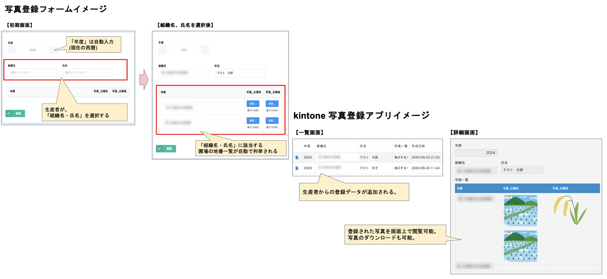 環境保全型直払に関する報告の一環として、出穂前後の写真を登録できるフォームおよび管理アプリを構築しました。