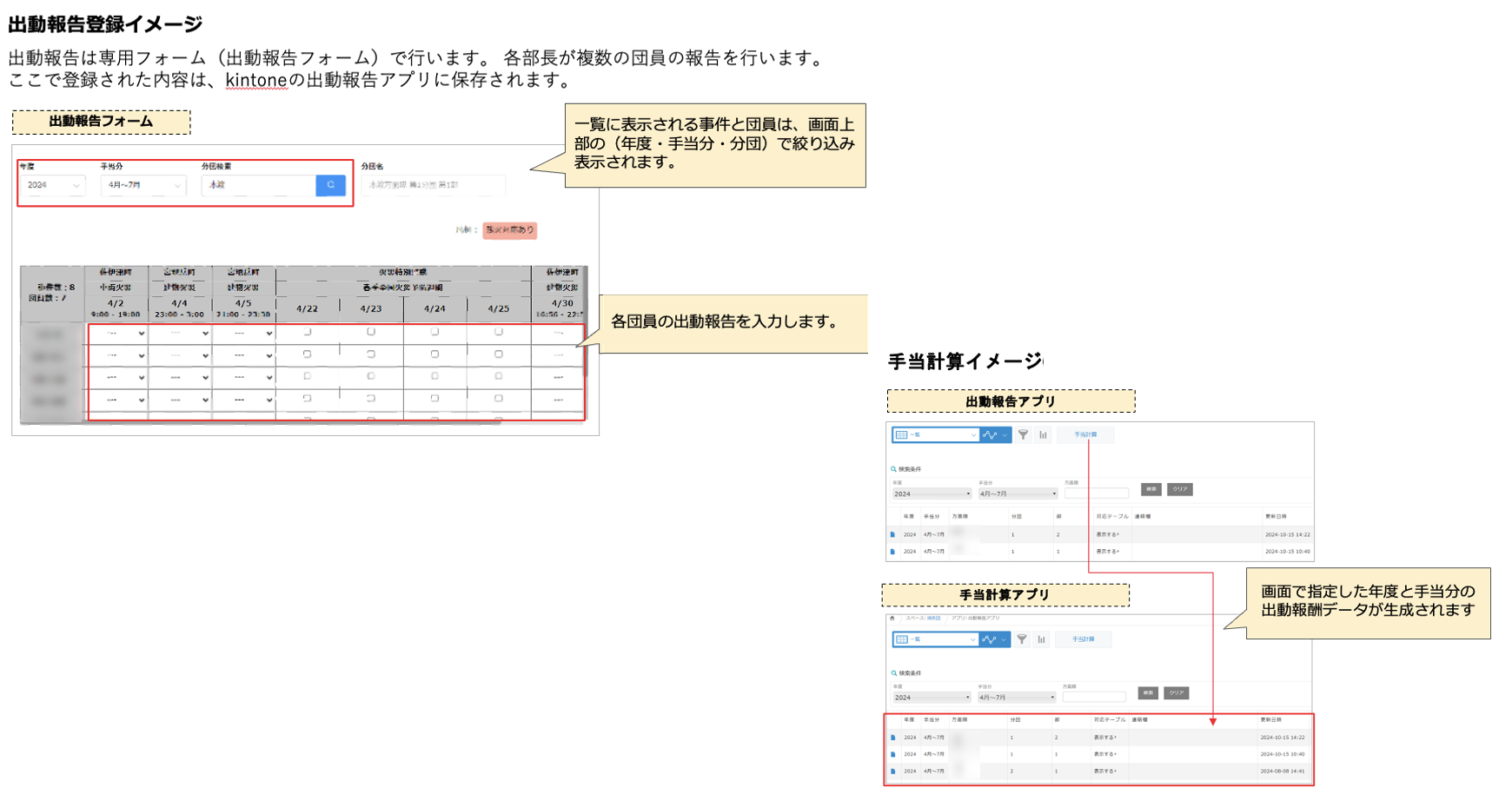 団員情報や出動報告などの登録を通じて、最終的に「出動報酬」と「年額報酬」を計算し、振込データを作成するシステムを構築しました。