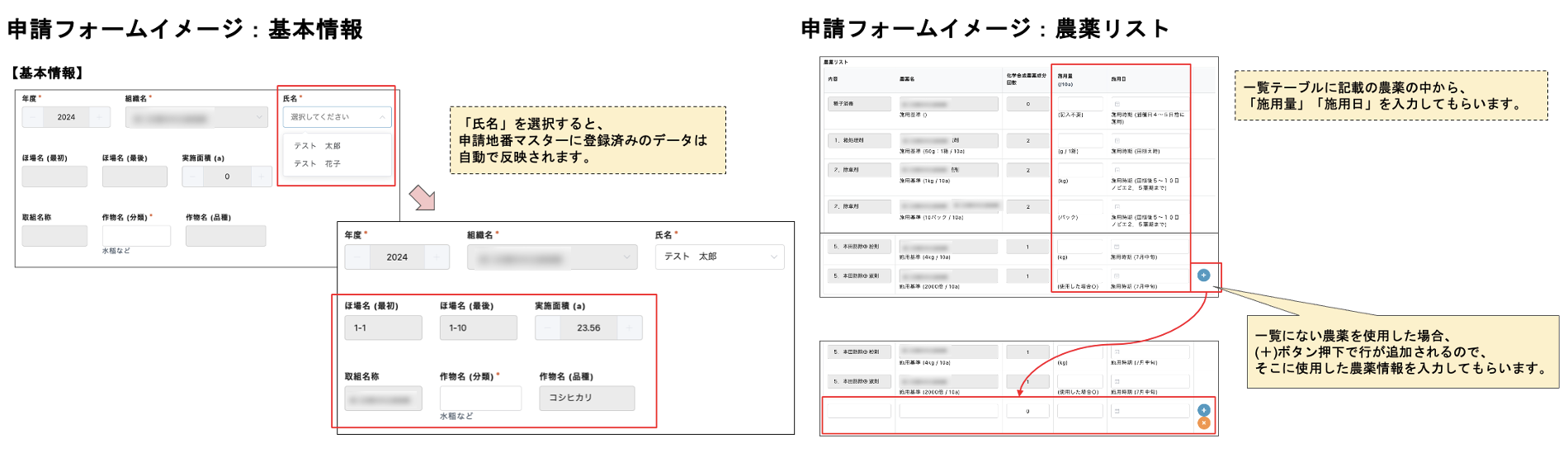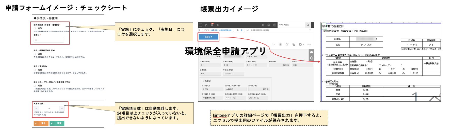 ・各生産者からの申請や報告内容の自動的な環境保全管理アプリへの登録による確認や集計作業の効率化、および国の様式へのボタン1つでの出力機能の実装