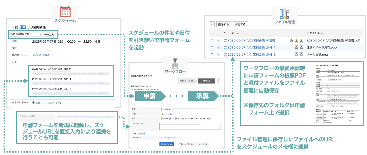 ・登録したスケジュールから、ワークフロー機能が直接起動され、ワークフロー申請画面にスケジュールの件名等が自動反映。また、申請時に報告書を格納するフォルダを選択