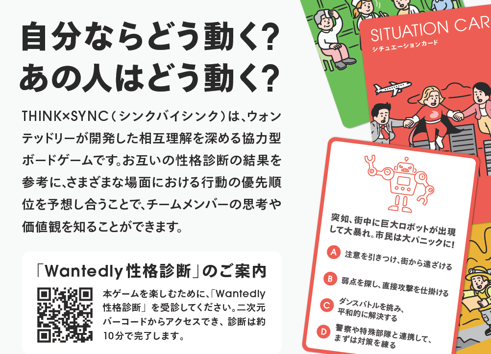 『THINK×SYNC』は、ウォンテッドリーが提供する性格診断サービスの診断結果をベースにした協力型ボードゲームです。プレイヤーはリーダーとメンバーに分かれ、シチュエーションに対する「行動の優先順位」を予想し合います。普段の仕事では見えにくい価値観や意思決定の癖を知ることで、互いの理解を深める設計となっています。